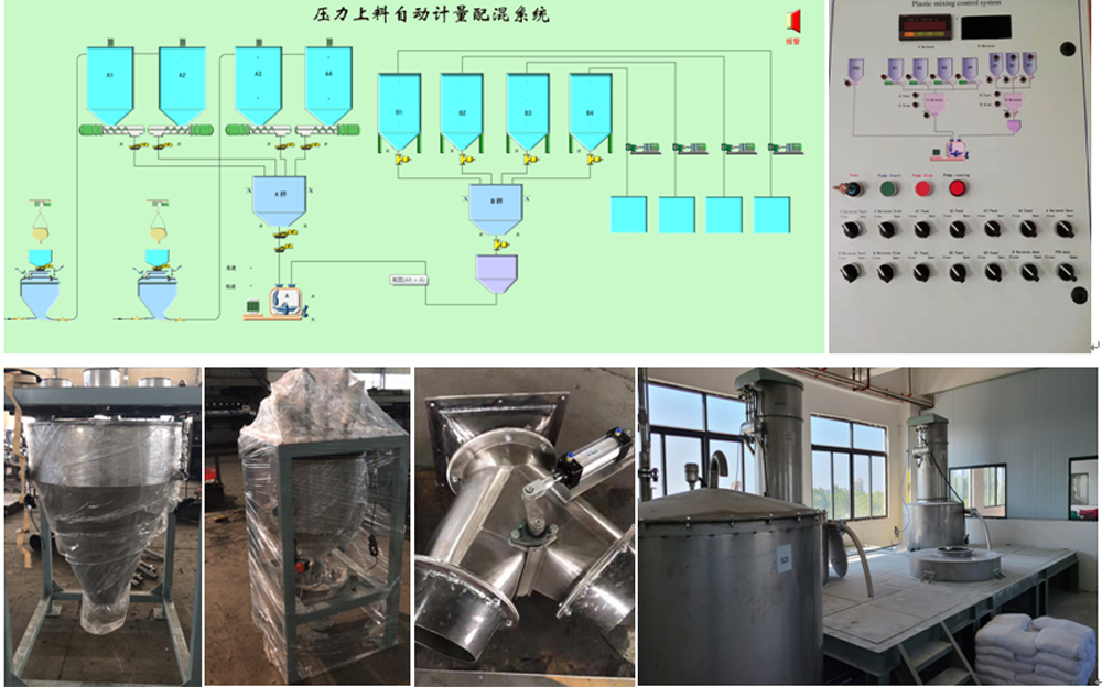粉液自动配料系统(又可称上铺机)主要安装在高混机或密炼机前端